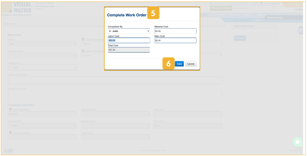 5. Choose the name of the engineer/maintenance person who completed the work order and enter any related cost.