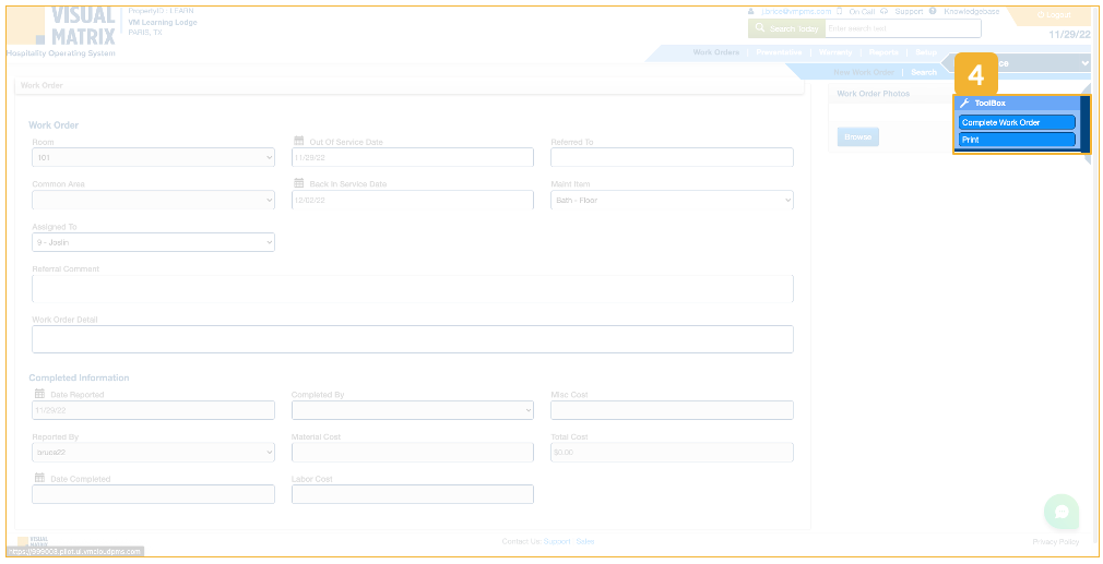 4. Click on "Complete Work Order" from the Toolbox on the right.
