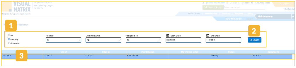 2. Click Search to bring up work orders based on the pre-selected filters.