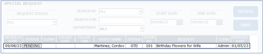 ? Watch Video Path: Front Office > Reservations > Search and Open the Reservation 1. Click New next to Special Requests on the reservation. 2. Click New to add a special request. 3. Select the Date, the Department that will fulfill the request and ...