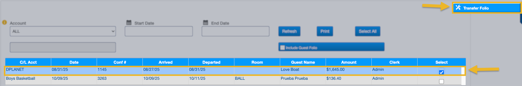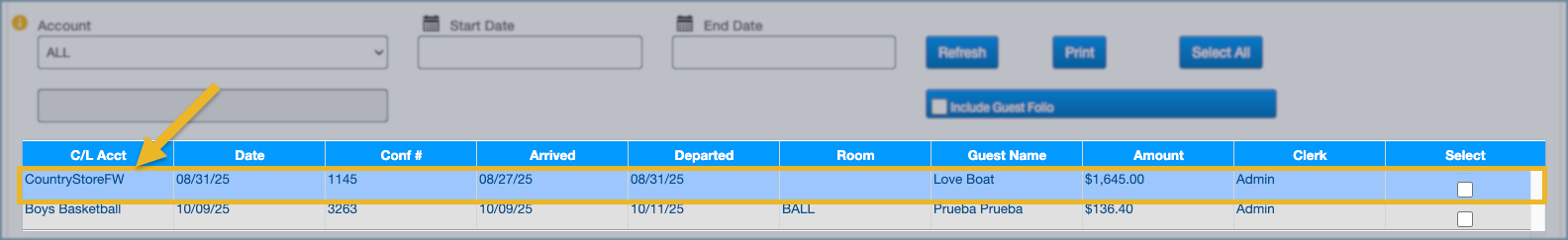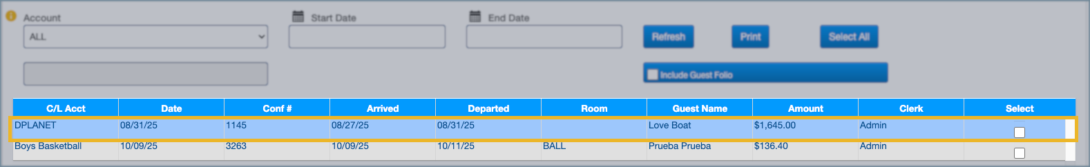 4. The folio will now move to the correct account and will appear under that account in Print Invoices.