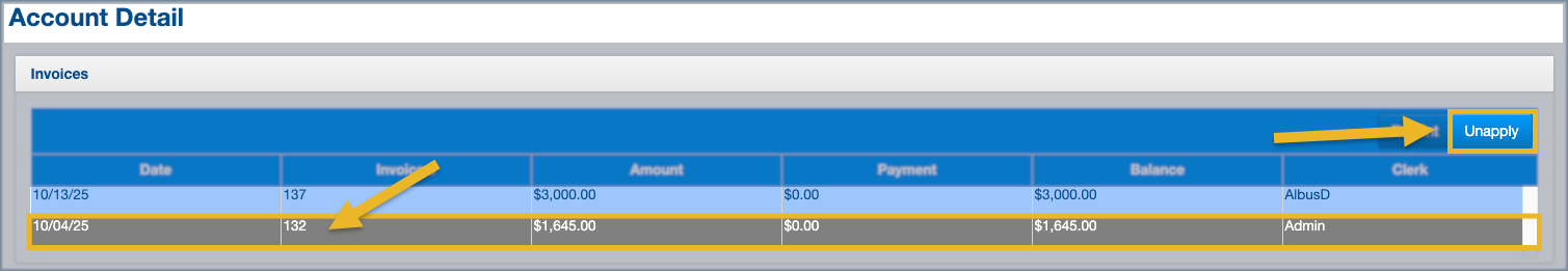 1. In the Account Detail, select the invoice and click Unapply. Click OK to confirm the action.