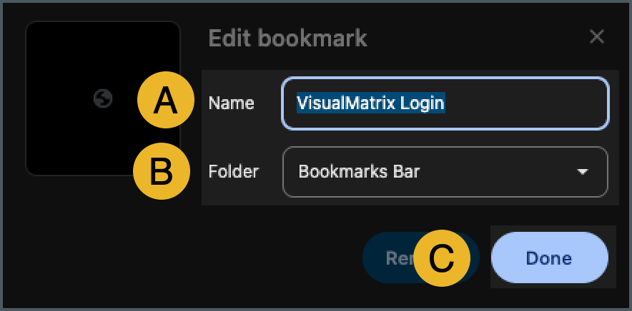 5. Optionally, you can modify the bookmark's name (A) and select the folder for storage (B). Additionally, you have the option to add it to the bookmarks bar for convenient access. Once you are content with the details, click "Done" (C).