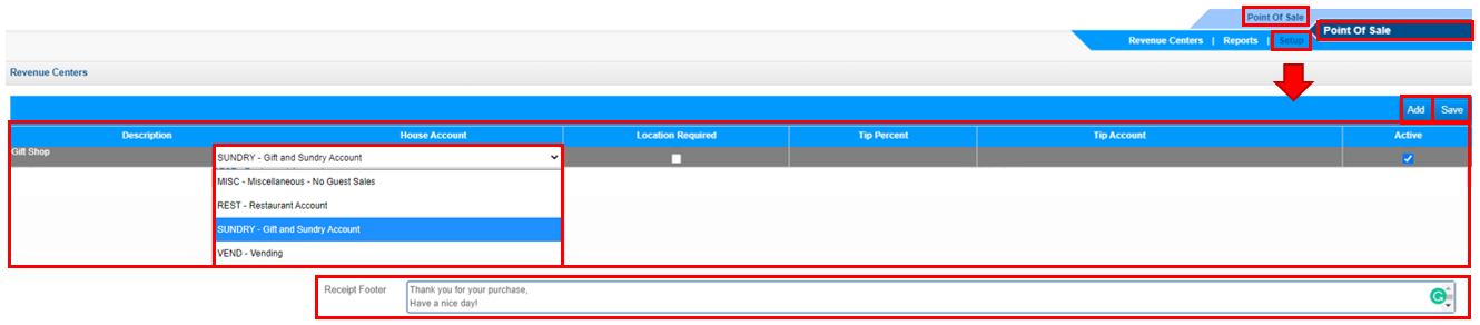Path: Point of Sale > Point of Sale > Setup > Revenue Centers.