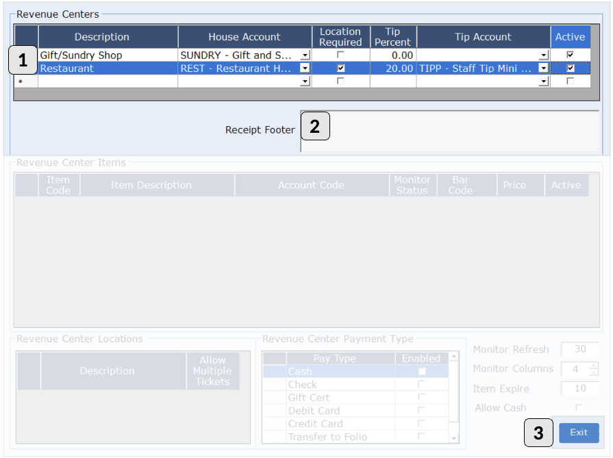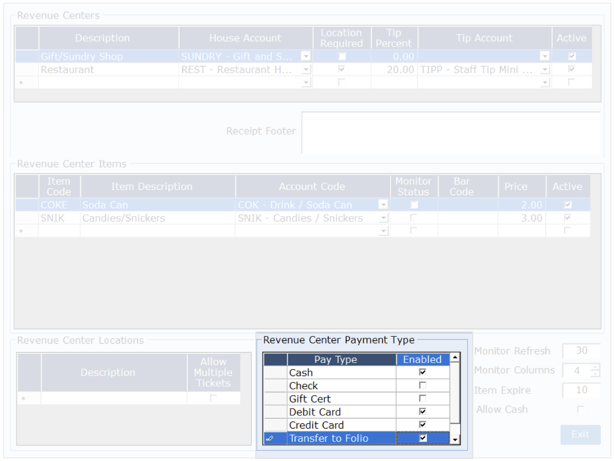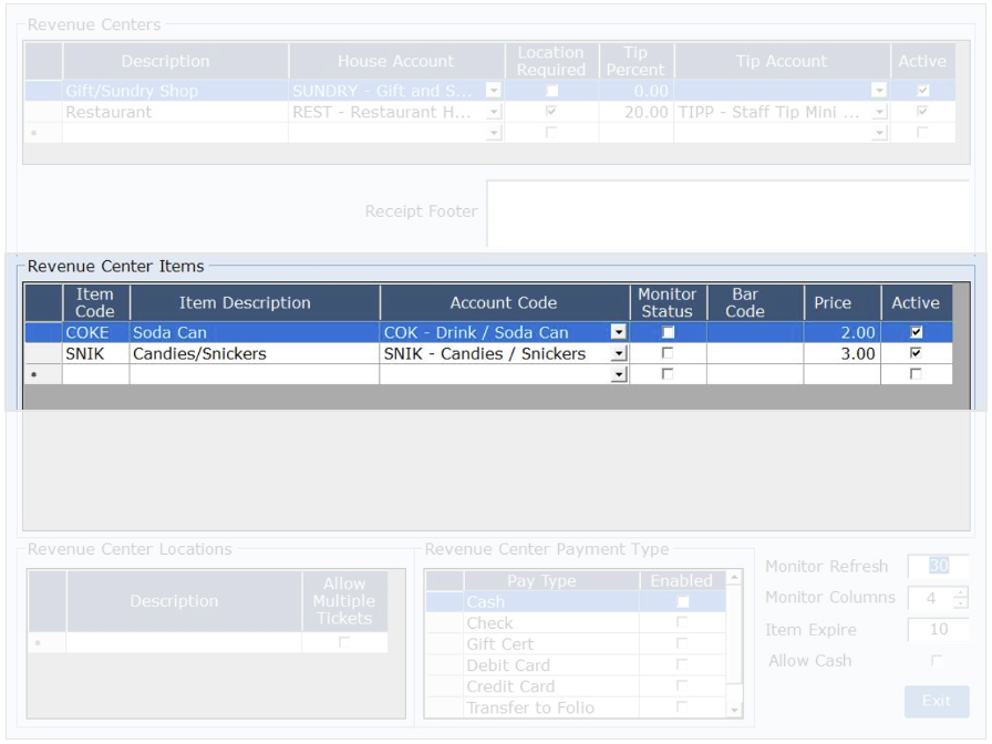 - do not check the Monitor Status. This field will be for a restaurant-type revenue center item.