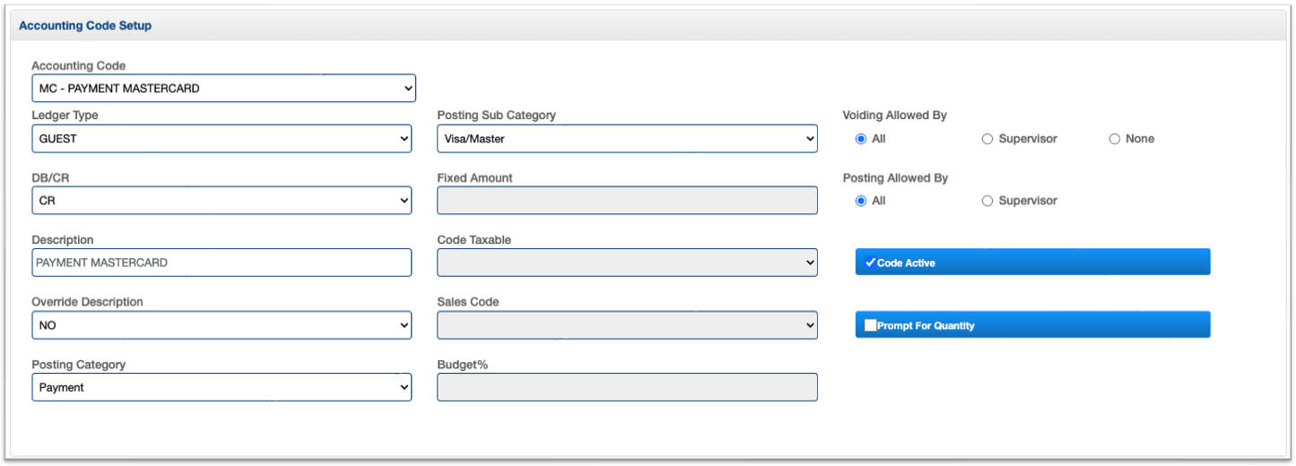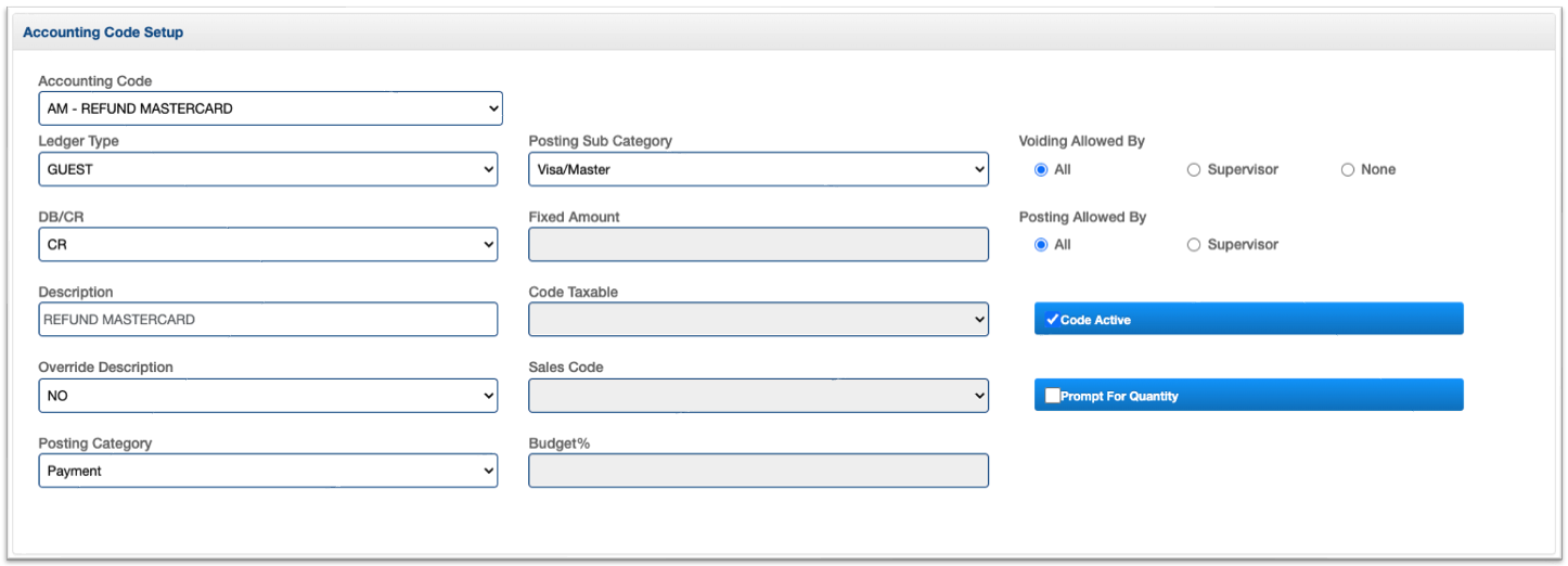 In Visual Matrix, Visa and Mastercard payments/refunds are grouped under a single code, VS/MC Payment (and VS/MC Refund). If you need to separate them, you'll first need to create a new code for Mastercard payment/refund and then update the Visa accounting codes accordingly. The following steps will guide you through the process of creating the new MC codes. For assistance with setting up the same codes for Advance Deposits, please contact the Visual Matrix Client Experience team.