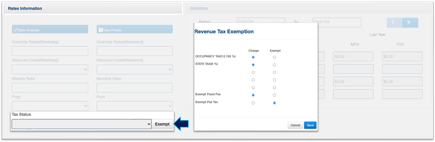 8. If this Company is under a Tax Exempt Status, click on "Exempt" and select which taxes that needs to be exempted. This selection will update the tax status.