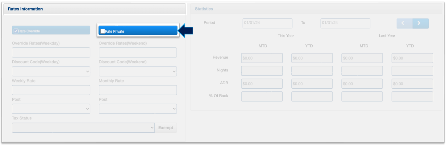 9. Finally, select whether the Company rates are "Private." Private rates do not appear on the registration card and are used for guests not directly paying the bill, such as OTA prepaid reservations or third-party payments.