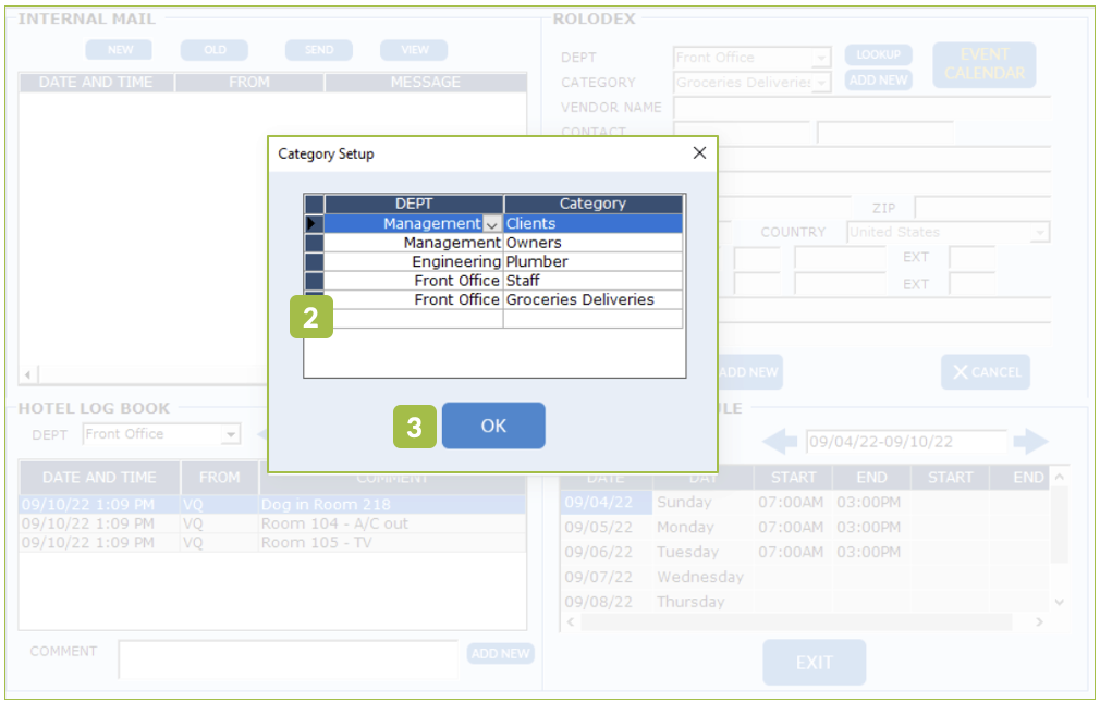The Rolodex only exist in Desktop PMS. The Rolodex helps you store business contact information by department. Path: Log in > Open any department > Info 1. Click on Add New next to Category. 2. Choose the Department. 3. Choose the Category within ...