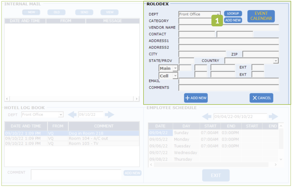 The Rolodex only exist in Desktop PMS. The Rolodex helps you store business contact information by department. Path: Log in > Open any department > Info 1. Click on Add New at the bottom of the section. 2. Choose which Department the contact is ...