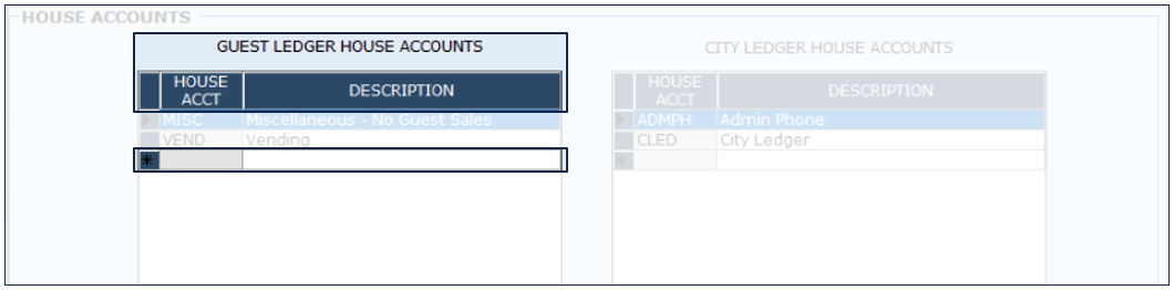 House accounts are set up for account tracking and/or postings used in various aspects of the Hotel. There are two House Accounts available for usage in Visual Matrix: Guest Ledger and City Ledger*.