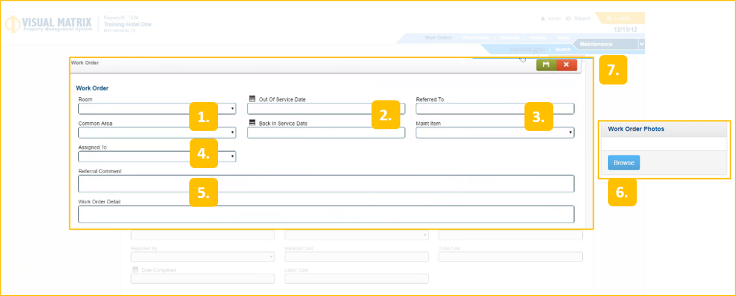? Watch Video You can easily search for a work order in Visual Matrix by using filters like date, room number, type, and status to find the specific work order you're looking for. Path: Maintenance > Work Orders > Search 1. Narrow down the search ...