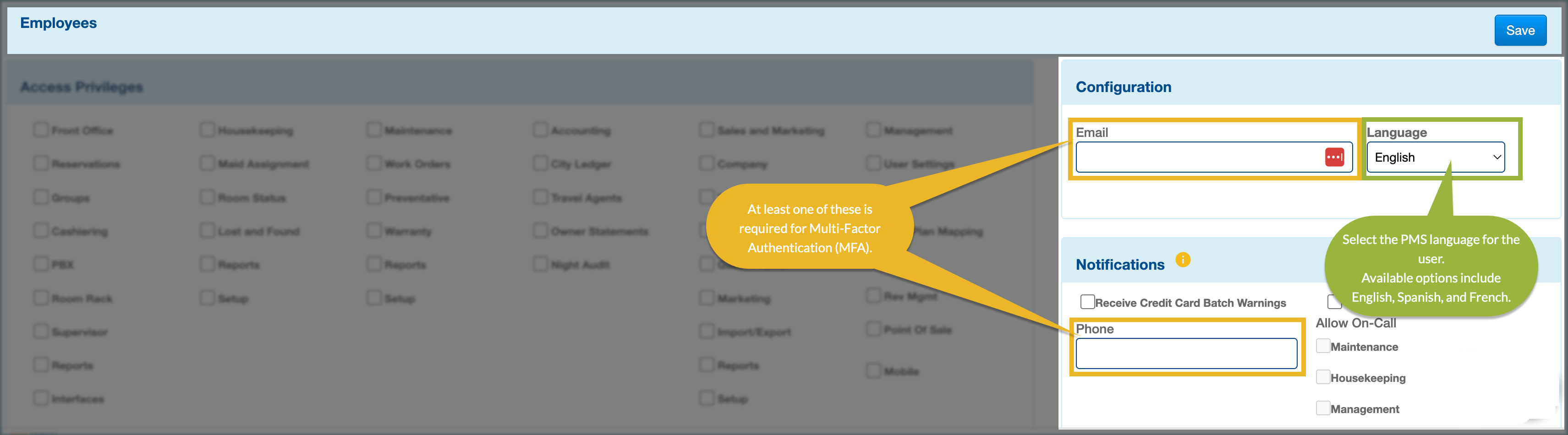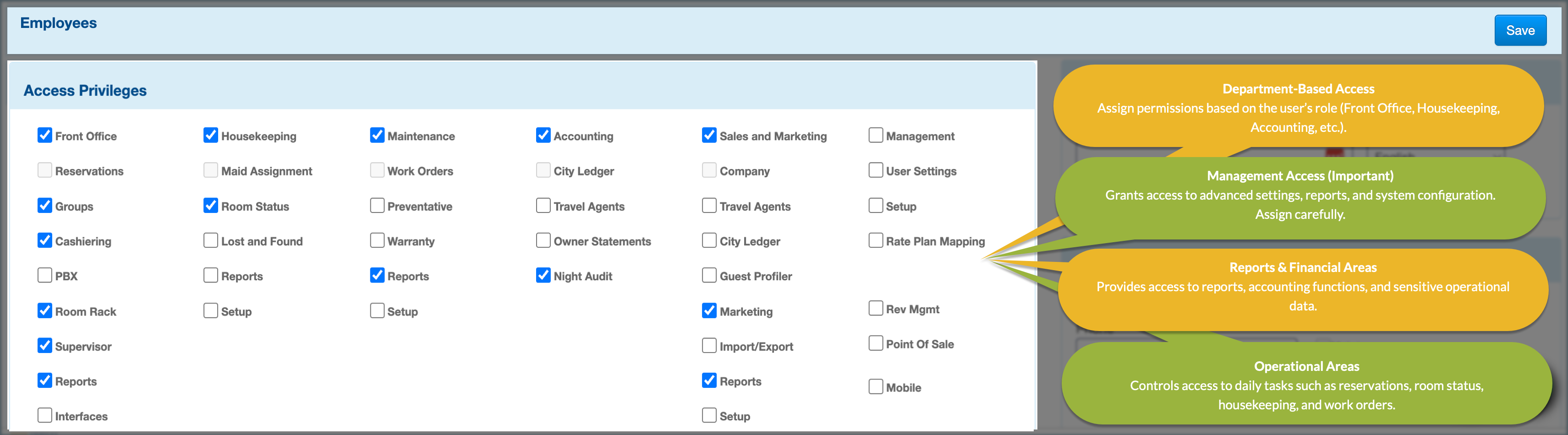Setup: Access to Property Settings, Accounting Settings, Rooms, Rates, and Interfaces