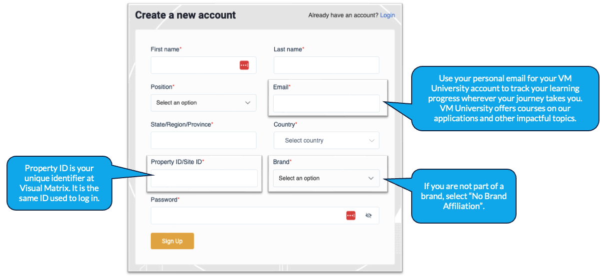 For any other question, send an email to university@visualmatrix.com. The VM University is currently only available in English. What email should I use to create my account? VM University is not linked to your property but to you. Even if you leave ...