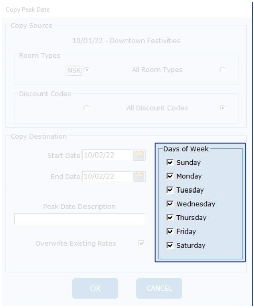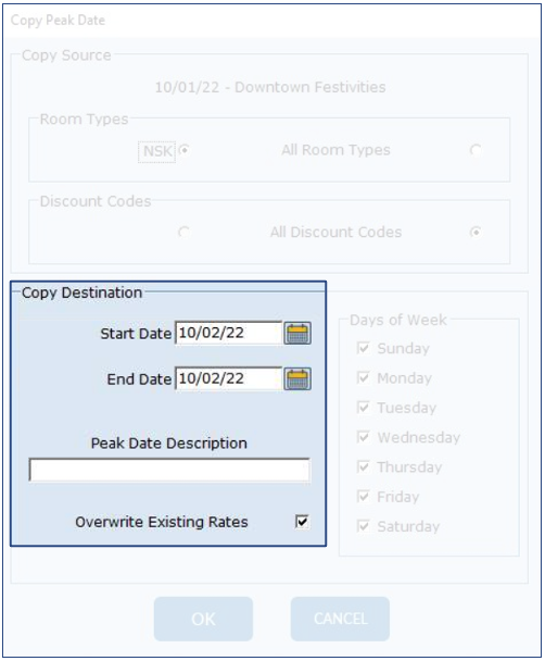 5. Enter the date(s) and a description for the new peak date(s). If some peak dates already exist for those same days, choose to replace them or ignore the copy for those days and keep the existing peak dates.