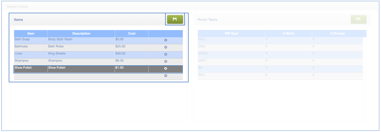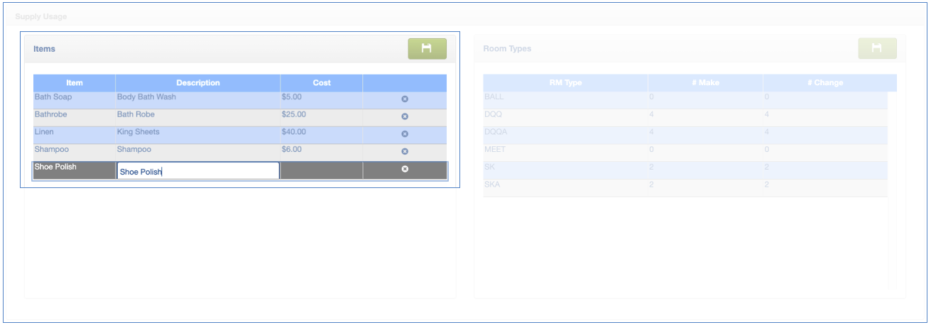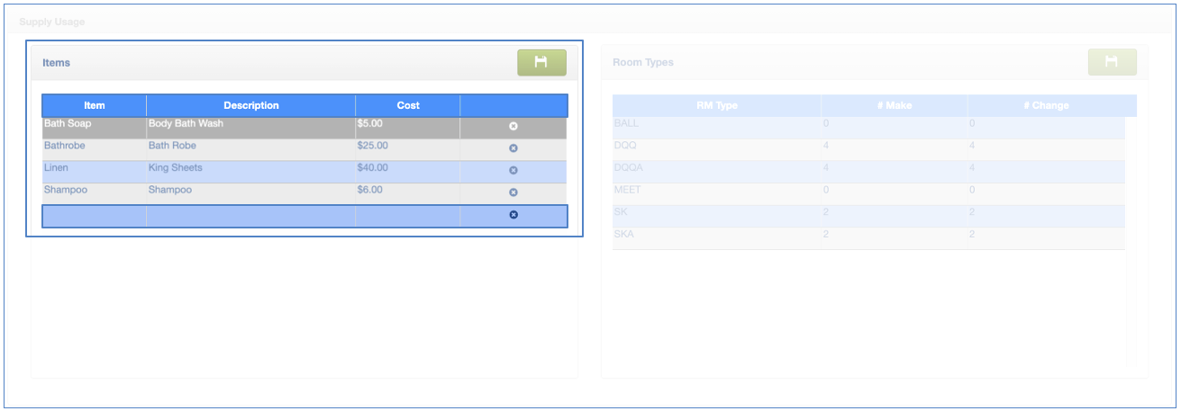Supply Usage is a functionality that enables you to monitor and record the consumption of supply items in each guest room. This feature helps you keep track of both the quantity and cost of supplies used, ensuring efficient inventory management and cost control.