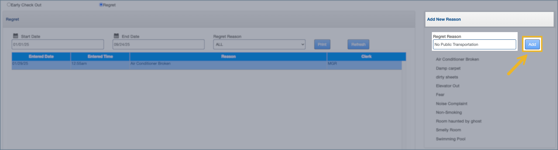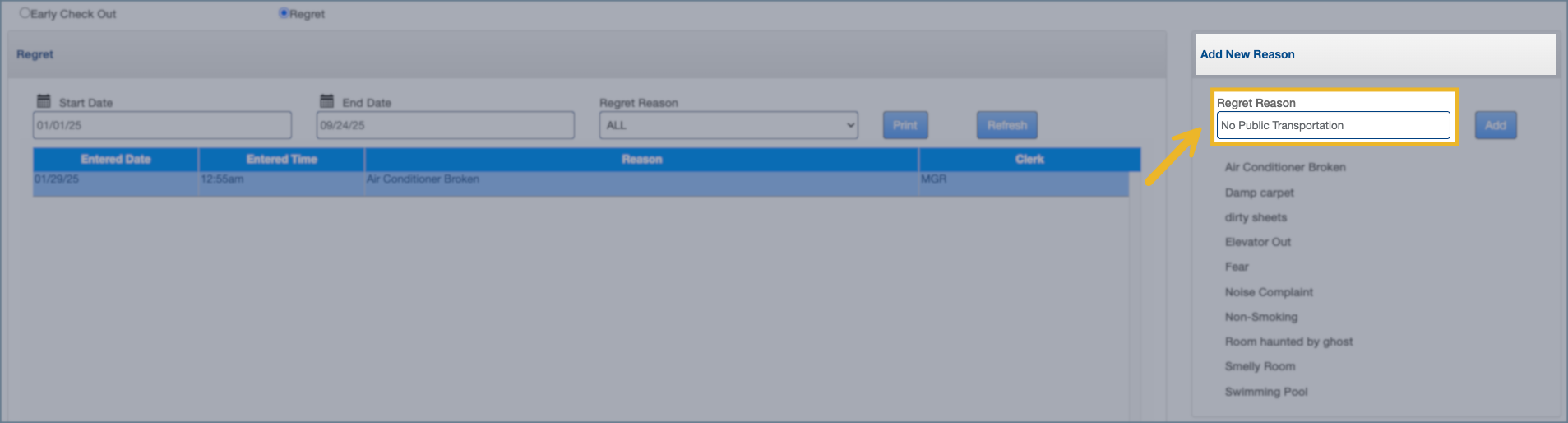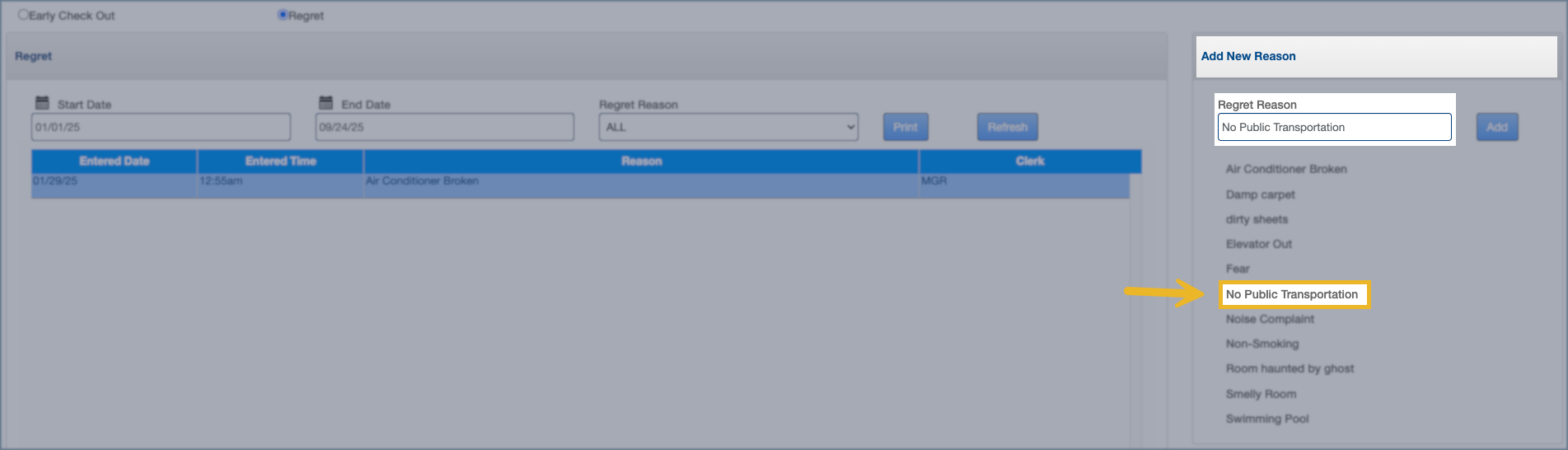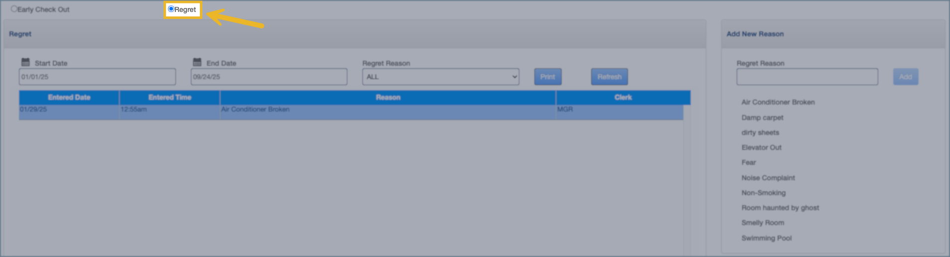 1. Select the Regret option to open the list of regret reasons used when recording lost bookings.