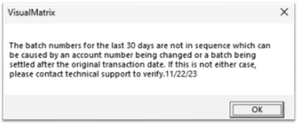 If you haven't changed processors or gateways and encounter this message, it suggests that a batch number is missing, which is unusual. Typically, if a batch hasn't settled, the protocol between Visual Matrix and the processors is designed to prevent any subsequent batches from settling until the first unsettled batch is resolved. Please