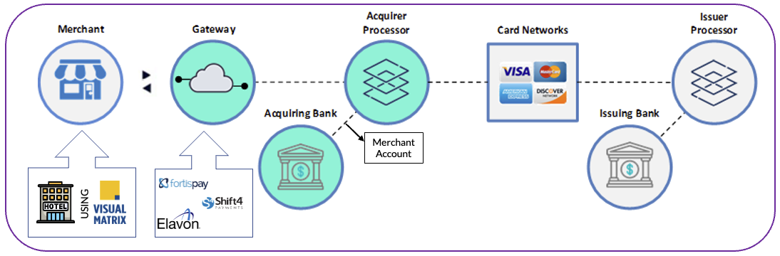 When the hotel requests a credit card authorization, they use Visual Matrix to send the request to the Processor. The Processor then sends the message to the guest bank verifying if the guest has enough funds to complete the transaction.