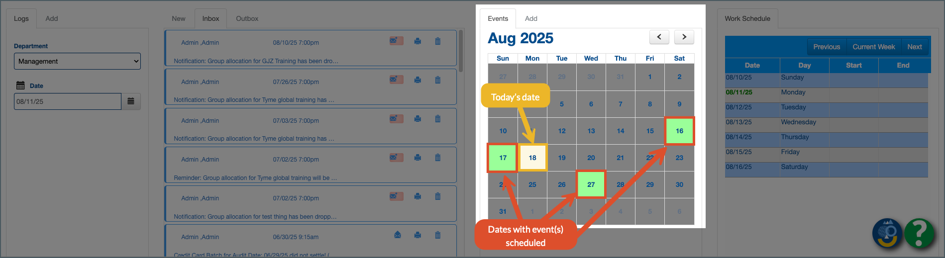Dates in light grey show today’s actual date (not a system audit date), while green dates indicate one or more scheduled events.