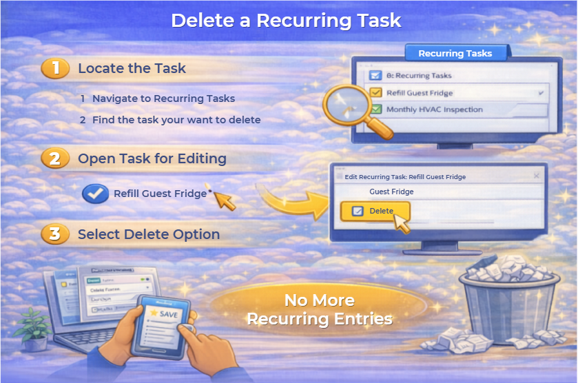 Recurring tasks are designed to automate routine operational work. However, there may be situations where a recurring task is no longer needed. This article explains how to delete a recurring task in MOP to keep your task list accurate and up to date.