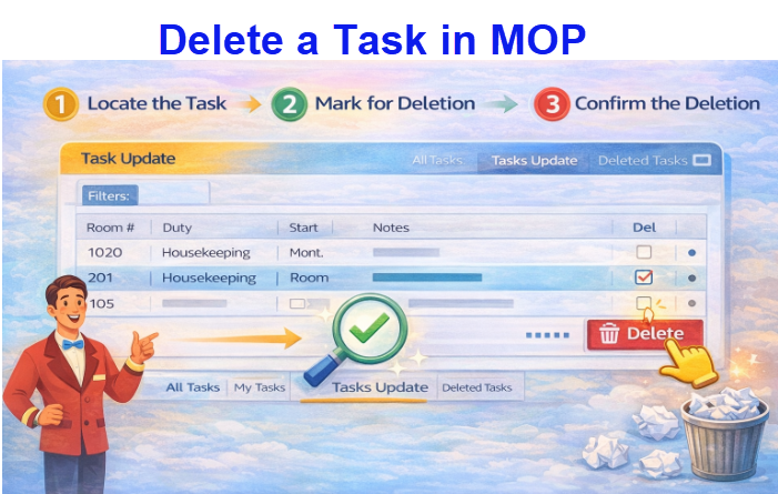 If a task was deleted by mistake, it can easily be restored in MOP. The system keeps deleted tasks in a separate section so they can be reviewed and recovered when needed. Restoring a deleted task will return it to the active task list so it can ...