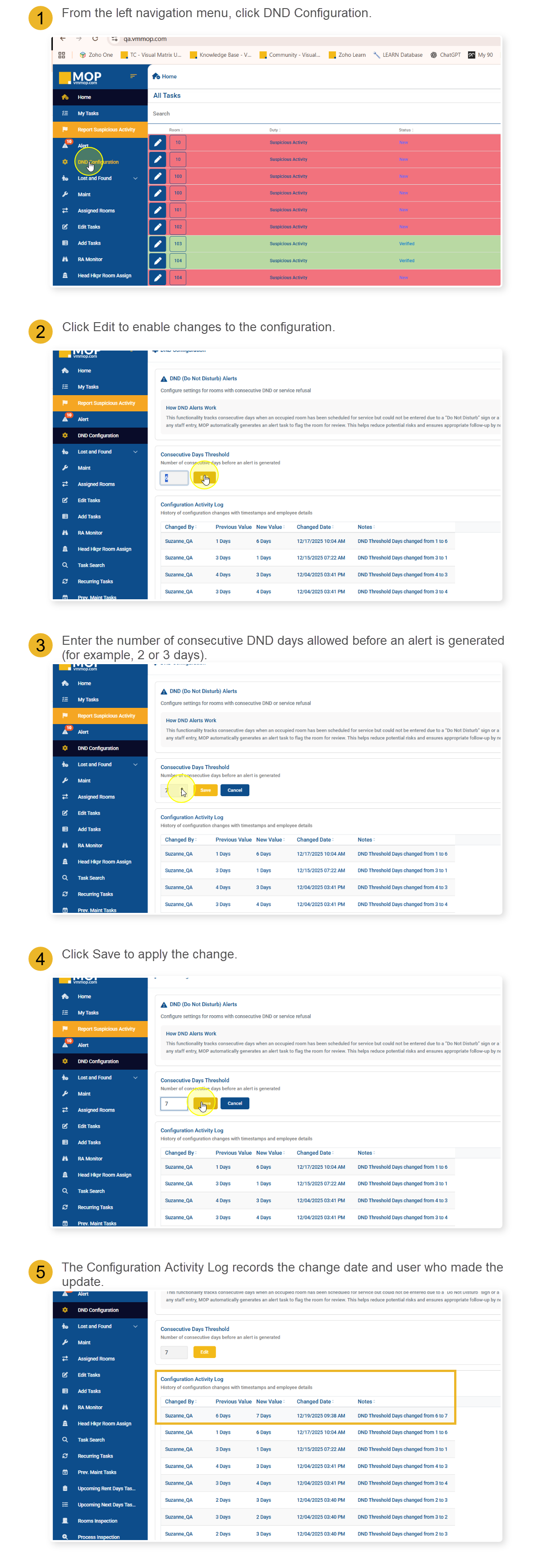 Use the steps below to configure or update the DND threshold for a property, which can be set between 1 and 7 consecutive days based on property or brand requirements.