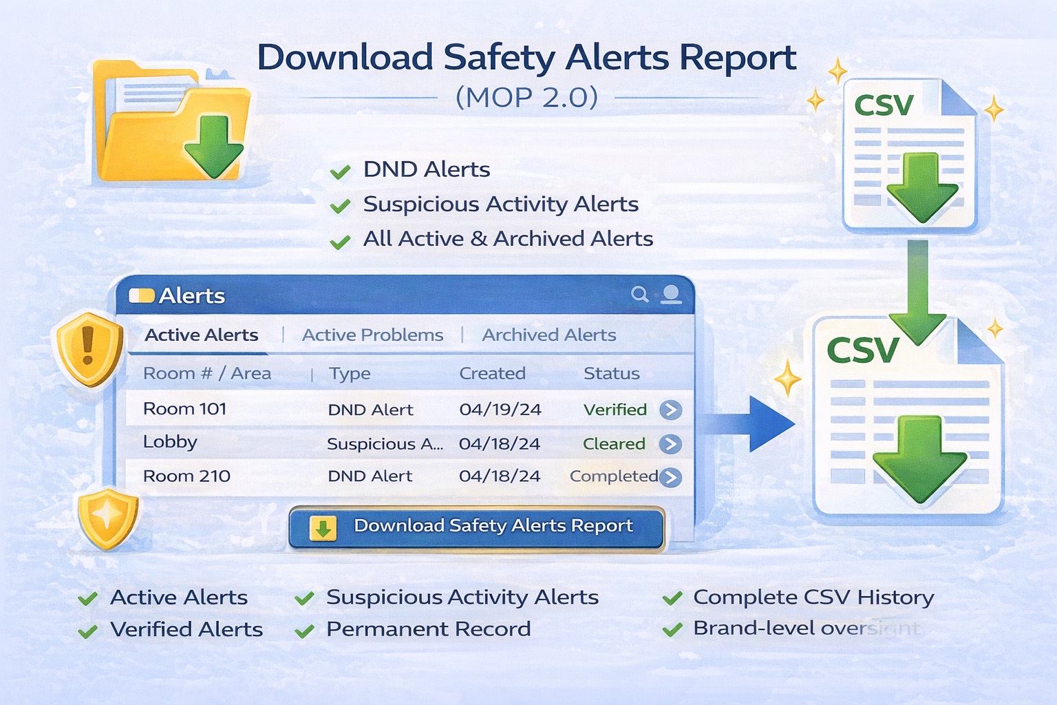 The Download Safety Alerts Report feature allows authorized users to export a complete CSV file containing both active and archived safety-related alert activity. The report includes: