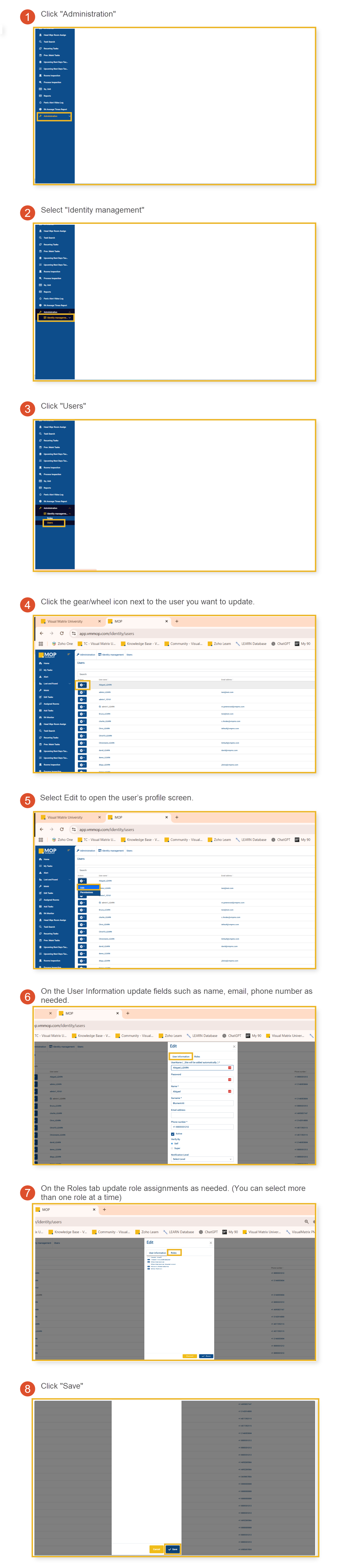 In MOP, you cannot delete a user account entirely—but you can deactivate it to prevent further access. Follow the steps below to safely deactivate a user. Step-by-Step Instructions Path: Administration > Identity Management > Users Tip: If you want ...