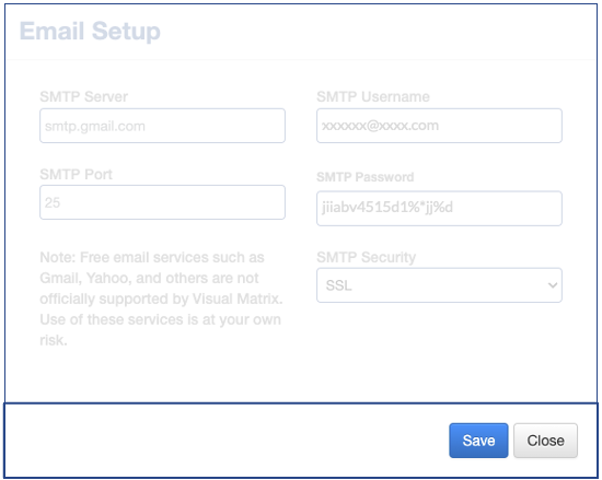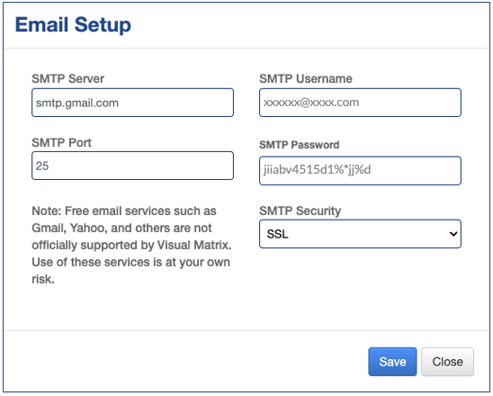 1. Enter the setup that you would have gathered from your email provider: SMTP Server, SMTP Port, SMTP Username (the email), SMTP Password (email box password) and the SMTP Security.