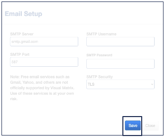 When emails are not sent, there are some first steps you can check. The first step you want to do is check if the current email settings in Visual Matrix are saving. If they are not, then there is an issue with those settings. If they are, then you can check if the emails are really not sending or do they get into the recipient spam/junk folder.