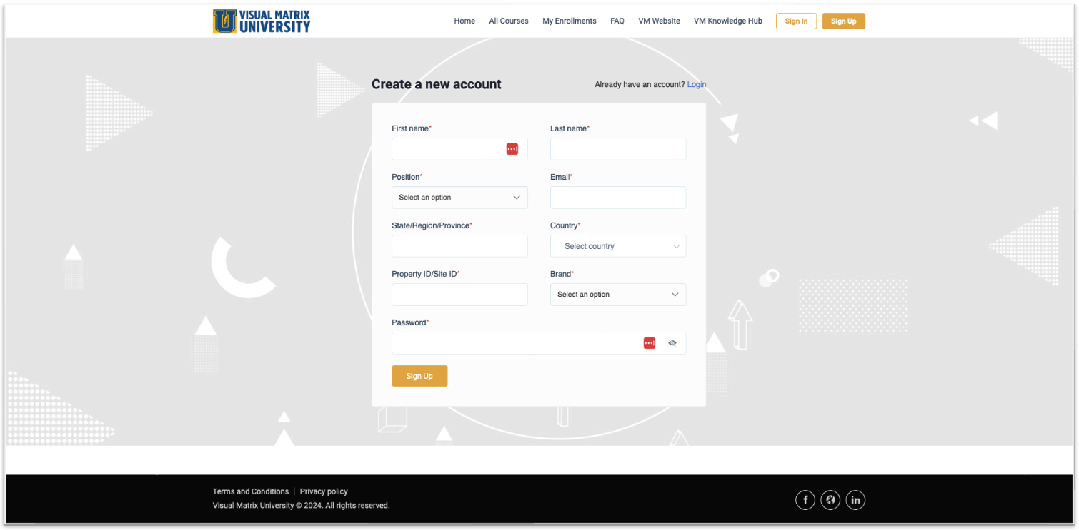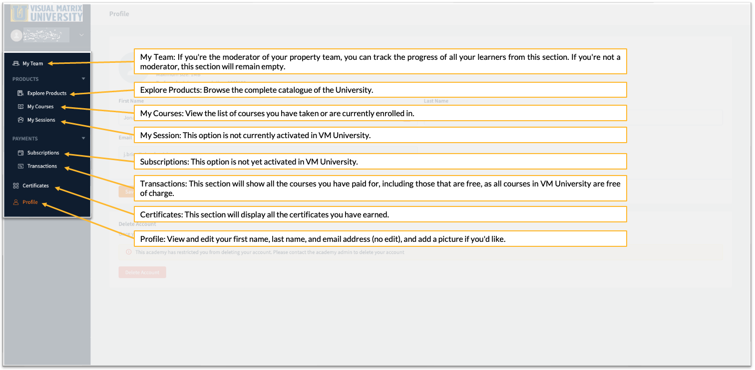 For any other question, send an email to university@visualmatrix.com. The VM University is currently only available in English. What email should I use to create my account? VM University is not linked to your property but to you. Even if you leave ...