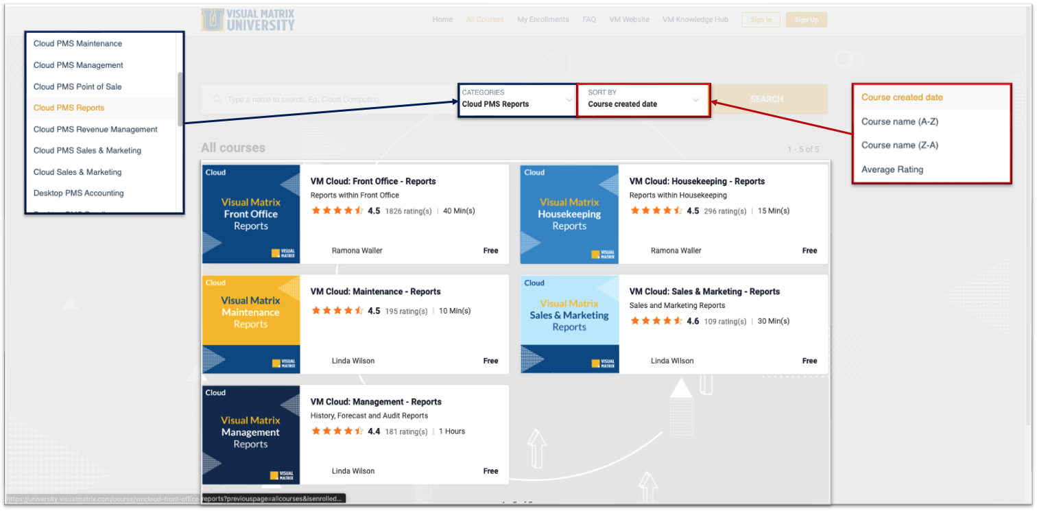 You can search for a course using keywords or by category, such as department, VM Cloud, VM Desktop, VM MOP, Reports, Supervisor, and more. Additionally, you can sort courses alphabetically or by their creation date.