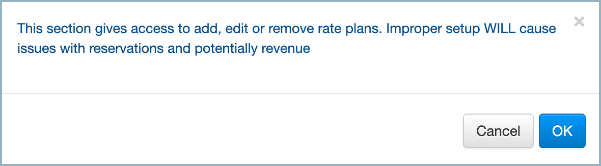 3. When enabling access to Rate Plan Mapping, a warning message will appear: “This section gives access to add, edit, or remove rate plans. Improper setup WILL cause issues with reservations and potentially revenue.” Click OK to confirm and proceed.