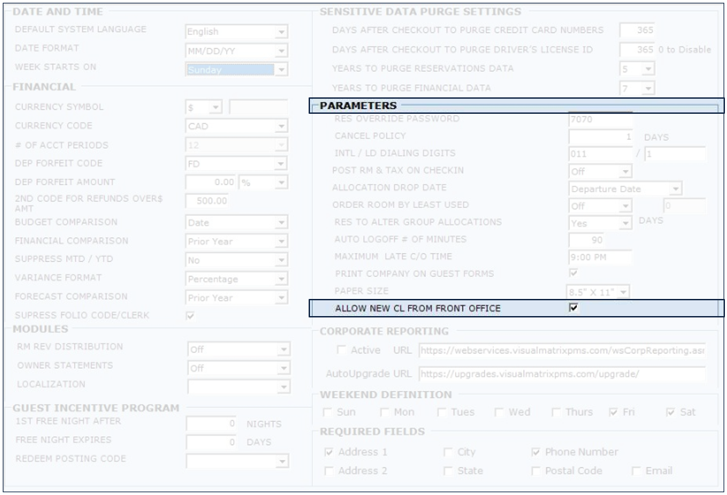 When a guest is associated with a Company on its reservation, the Company name and address can be displayed side by side with the guest name on a form, as shown below. Path: Management > Setup > Property > Parameters > Section "Parameters" (right ...