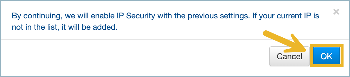 2. A confirmation message will appear: “By continuing, we will enable IP Security with the previous settings. If your current IP is not in the list, it will be added.”