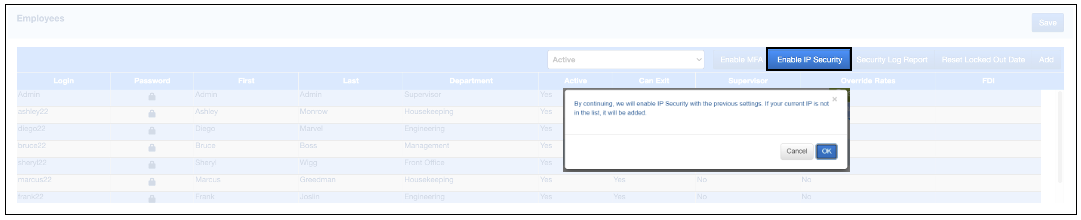 The feature should be enabled by default for security reasons. If it is not, it will have to be done from a computer in your hotel network. You can double check what your public IP is by using online applications like ipchicken.com. Path: Management > User Settings > Enable IP Security.