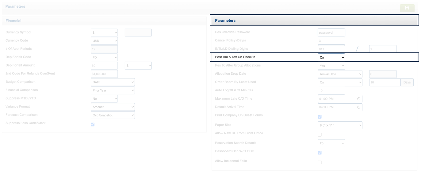 1. Choose "On" next to the parameter "Post Rm & Tax On Checkin".