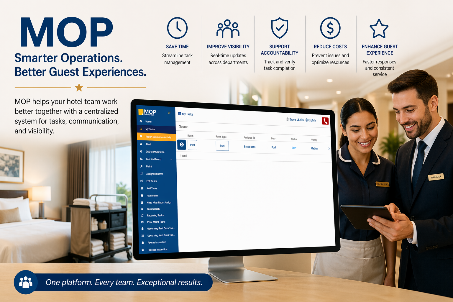Every hotel operates differently, and many properties already have processes in place that support their day-to-day operations. MOP is designed to build on those processes by helping teams streamline workflows, improve visibility, and create a more connected and efficient operation without disrupting what already works. This article highlights how MOP can support your existing operations by improving efficiency, communication, and consistency while helping your team save time and reduce unnecessary complexity.