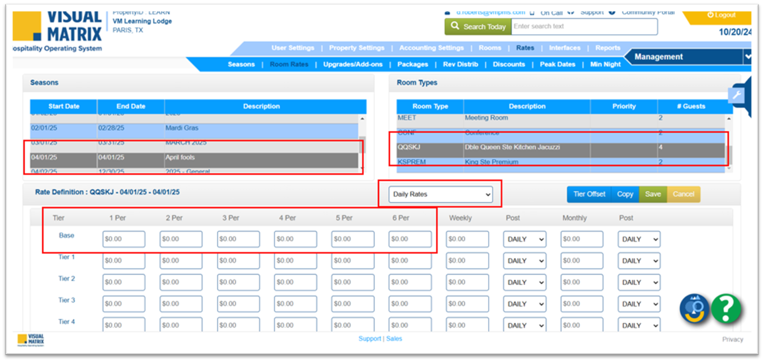 Tier Rates can also be applied when needed but to avoid a delay in your booking process, the Base Rate MUST be entered into the system for the specified Room Type and Rate Season you are booking.