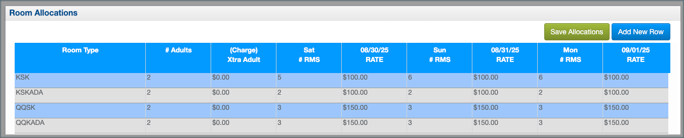3. In the Room Allocations section, add allocations for the extended dates and room types. For room types not needed, enter 0—do not delete them. Complete any required rate fields.