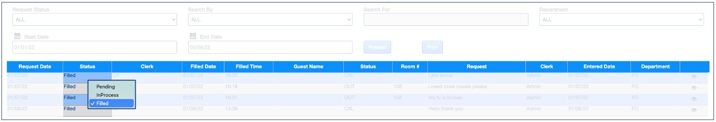 Once filled, a request cannot be changed back to In Progress or Pending.