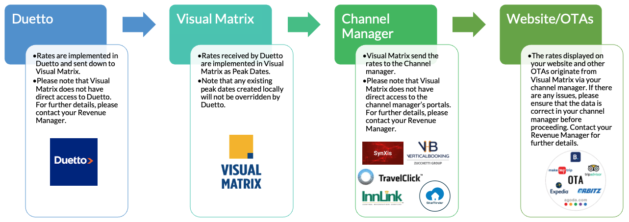 This article introduces the end-to-end data integration between Duetto (Revenue Management), Visual Matrix PMS (central data orchestrator), and your Channel Manager (i.e. SynXis, Vertical Booking, ...). Purpose To provide clients and their IT or ...