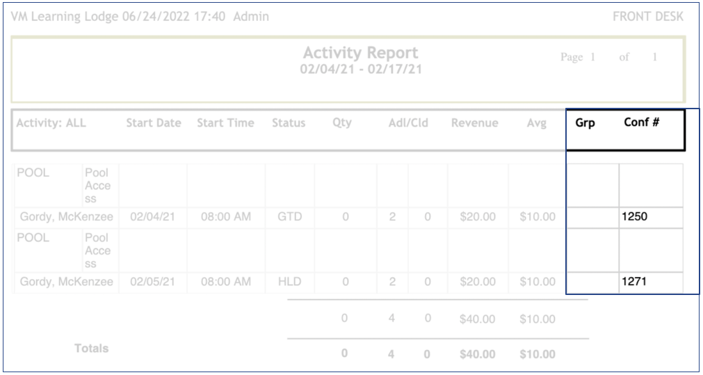 - Confirmation number of the reservation that booked the activity (group or individual).