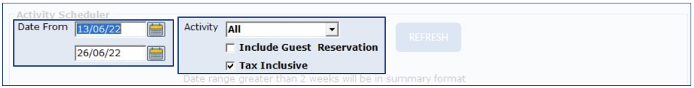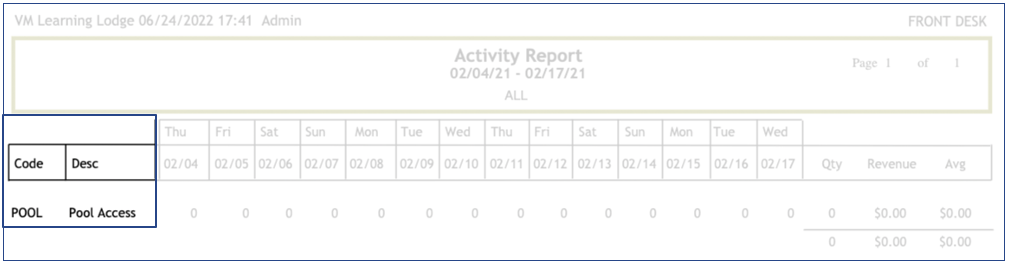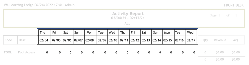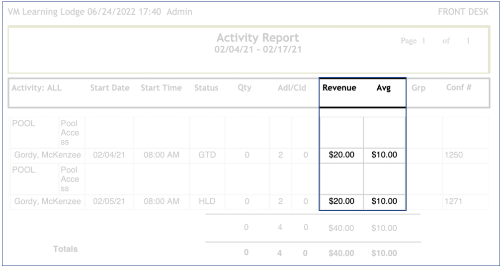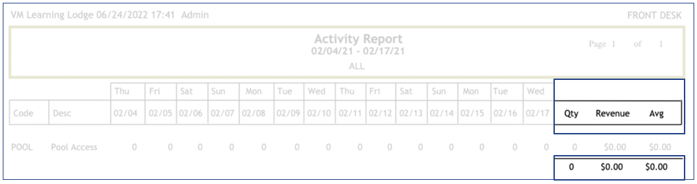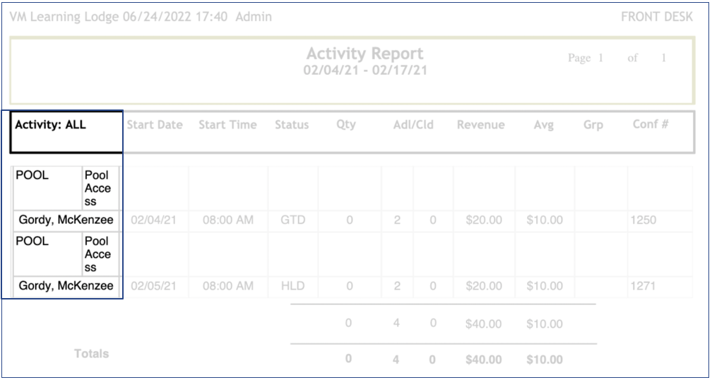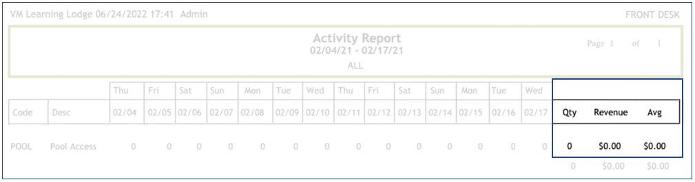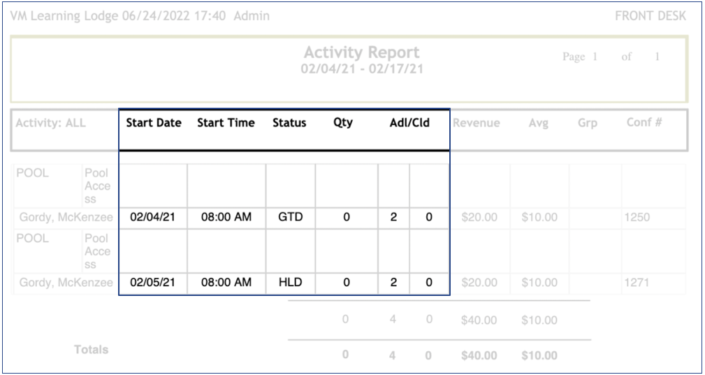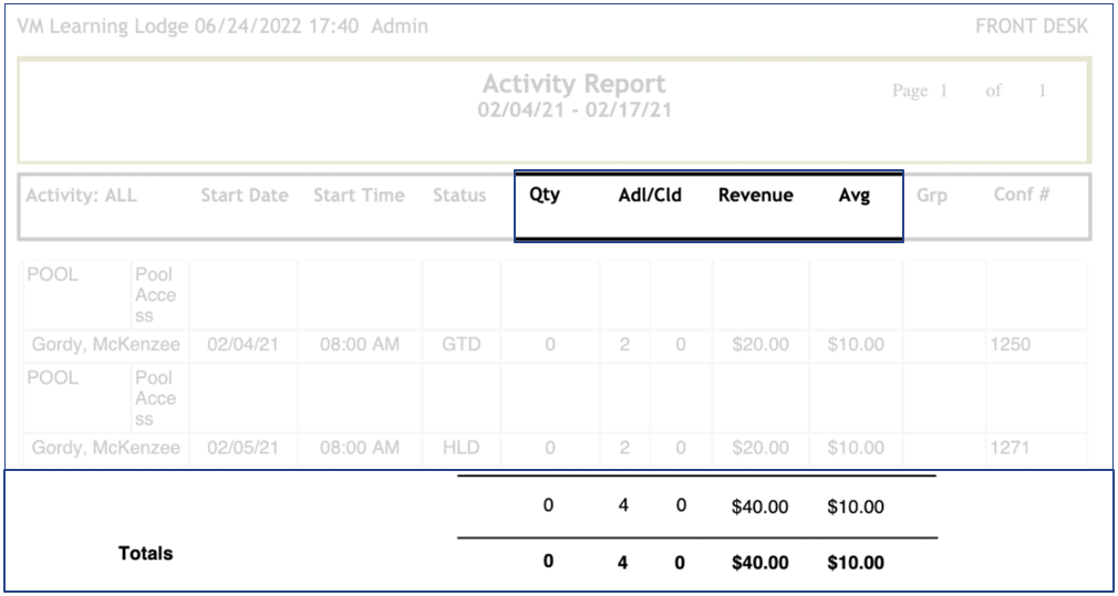 - Total of that activity booked for that time period, if activity booked by item (Qty) or by person (Adl - Adult/Cld - Children).