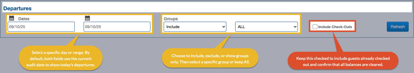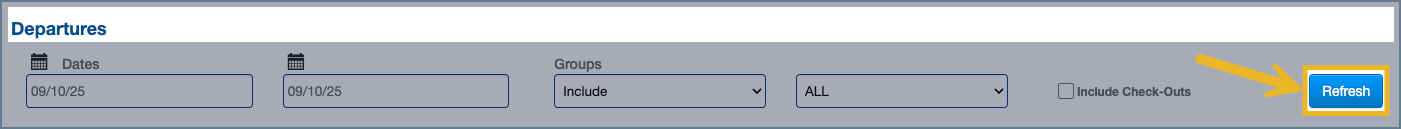 The Departures Report lists all guests scheduled to check out for the selected period. Use it to review each guest’s status, balance, and payment details, ensuring all departures are processed correctly before the end of the day.