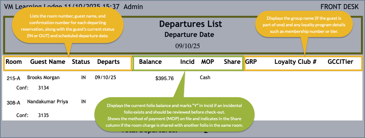 - Incid: displays “Y” when the reservation includes an incidental folio that must be reviewed before check-out.