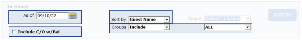 The In-House Driver's License report is a list of the occupied room numbers with the guest Driving License information.