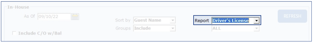 Path: Front Office > Reports > In House Guests > Choose Driver's License from the Report drop down.