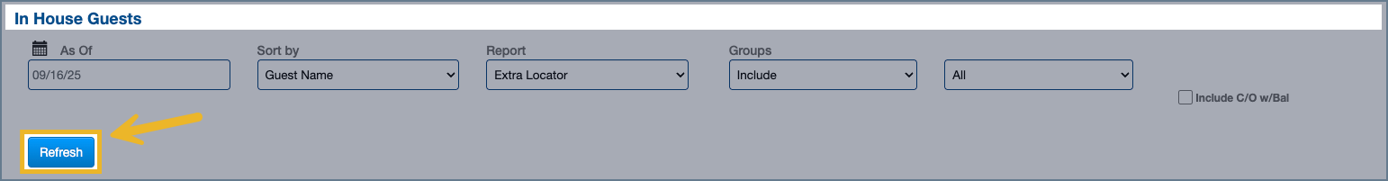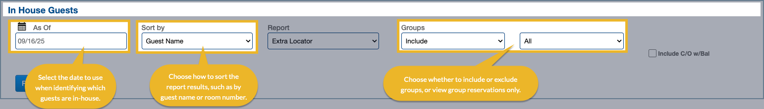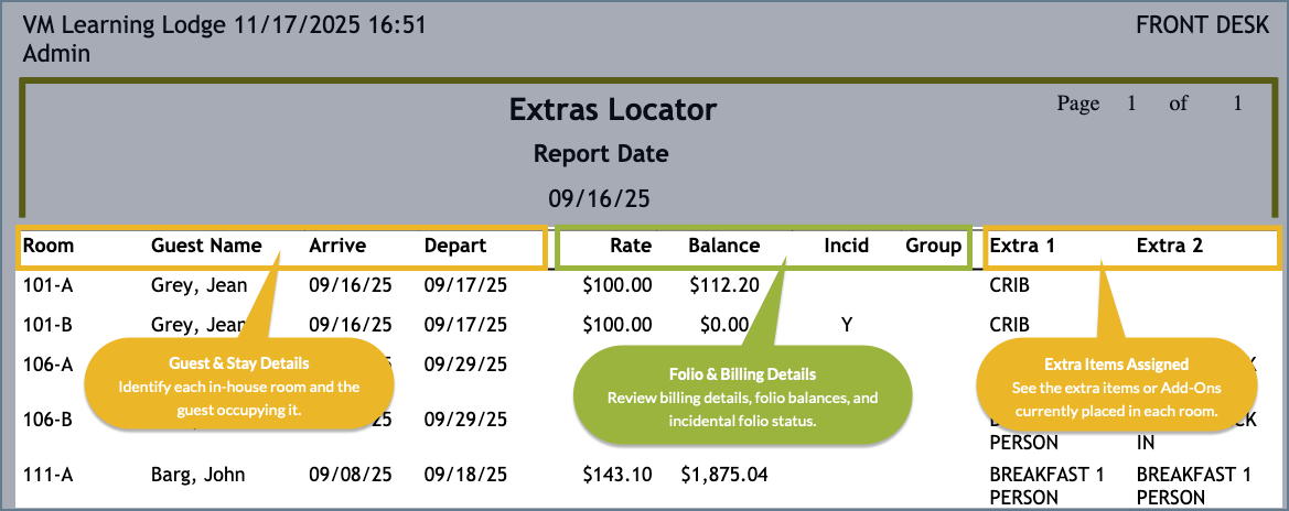Use this section to understand how the Extras Locator report displays each in-house reservation, including stay details, folio information, and any extra items (Add-Ons) assigned to the room.